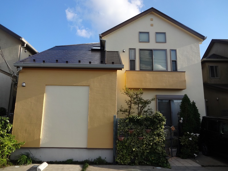 メイン色に明るいクリーム色、アクセント部にイエロー色といった、とても温かみのある外壁に仕上り