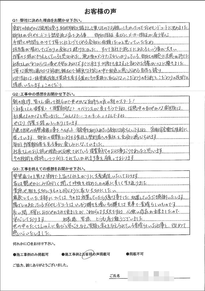 全ての塗装作業が終わり、お客様に確認していただいた際、「家が生き返りました。ダイヤモンドコートの上品な仕上がりに大変満足してしています。」というお言葉を頂きました。
