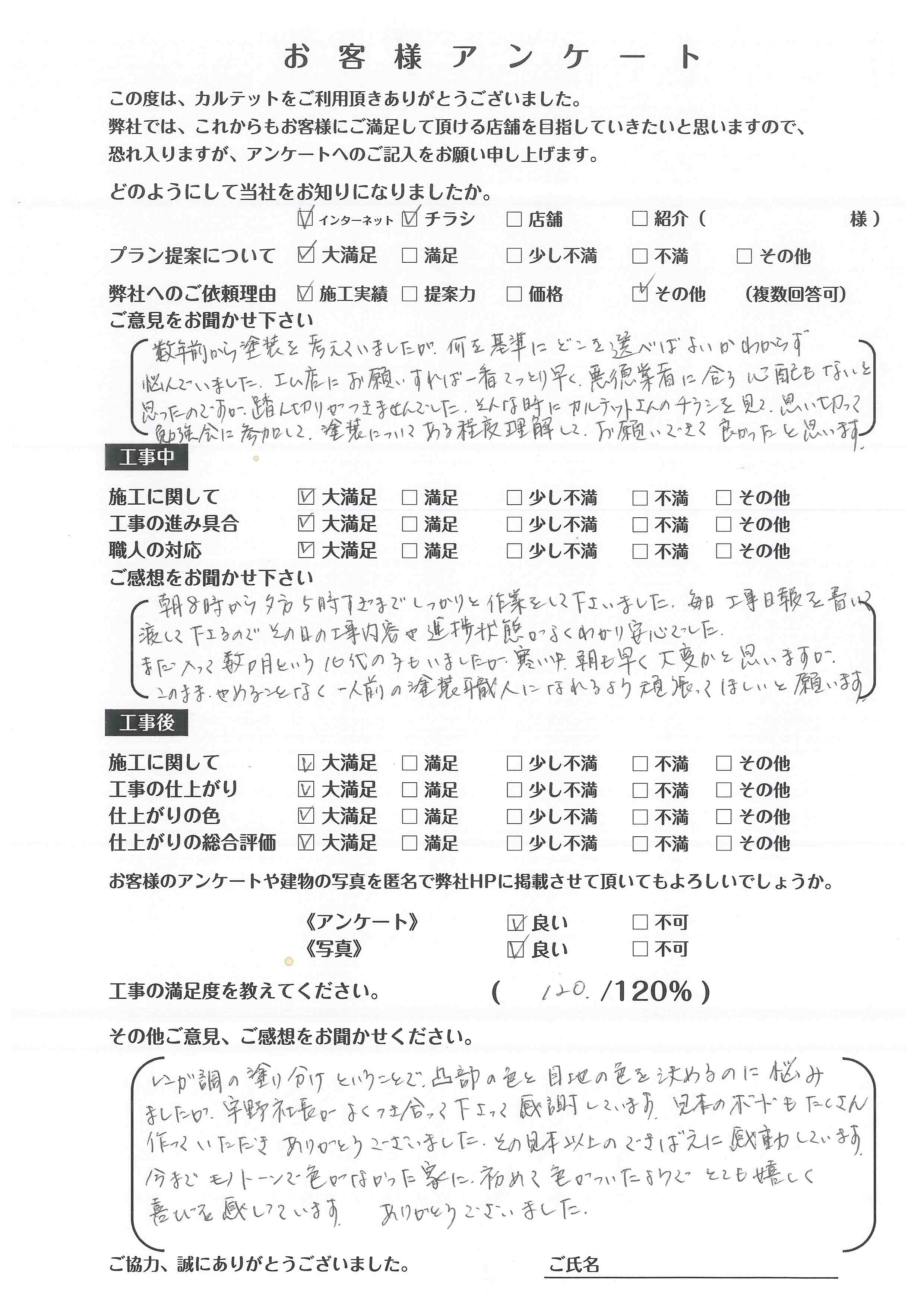この度はカルテットに工事のご依頼を頂きましてありがとうございました。工事期間中も施工スタッフにお気使いを下さりまして感謝の気持ちで一杯です。施工期間中もコミニュケーションを取りながらの工事進行でいたので、安心して工事の進行を進めることができました。工事完了後もしっかりとアフターメンテナンスを対応させて頂きますので、今後共宜しくお願い致します。