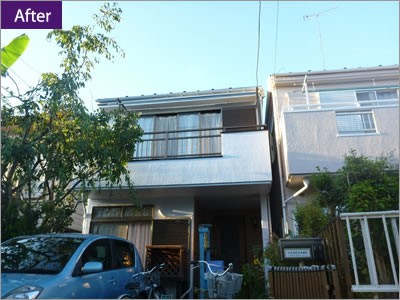 築17年で初めての外壁塗装ということと、サイクルコストを考え、ダイヤモンドコートを強くおすすめいたしました。 下地クラックも通常より大きな箇所がたくさんありましたが、オリジナル補修方法で目立たなく補修できました。また、外壁には目止めを含む5回塗り、屋根にも4回塗りのフッ素仕上げといたしましたので、品質に自信がございます。