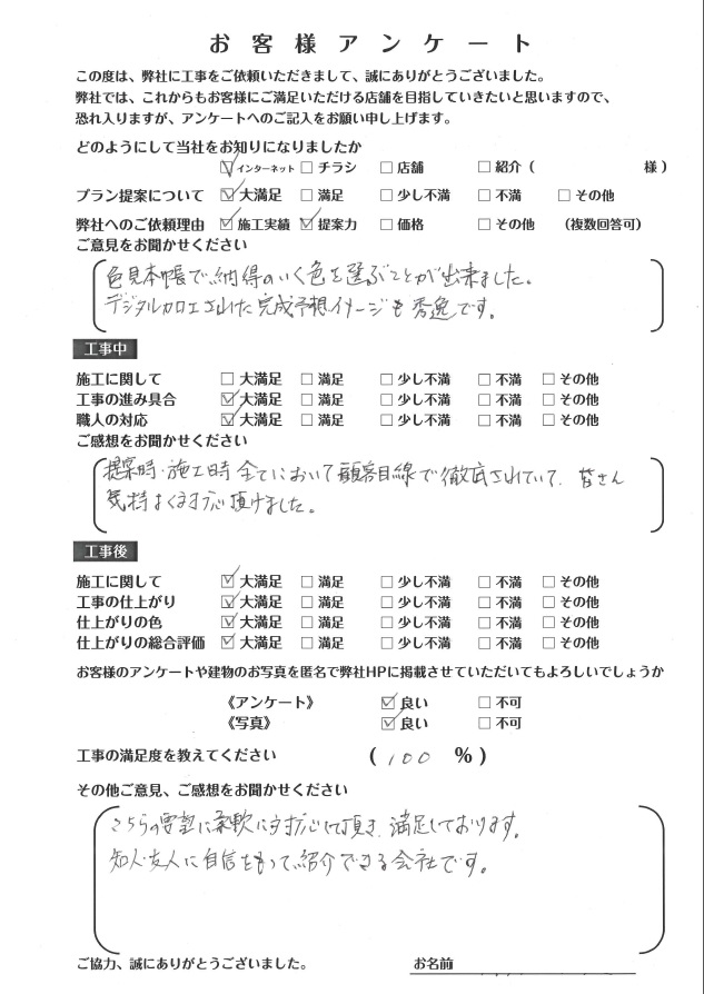 お施主様のご期待にお応えできる施工ができて一安心しました。我々の評価はお施主様からのアンケートの記述通りだと思います。アンケートは総合的に感じたことを、正直に書いていただいています。評価が低い時やご指摘を頂いた場合は素直に受け止めて次から改善します。我々はお施主様の声で成長をさせて頂いているのですから、感謝の気持ちを忘れず日々努力しています。