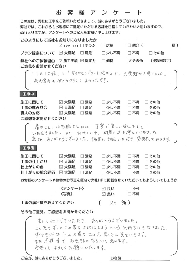 お施主様のご期待にお応えできる施工ができ、一安心しました。我々への評価は全てアンケートの記述通りだと思います。プロの職人に工事を頼むのですから、上手いのは当然です。アンケートは総合的に感じたことを、正直に書いていただいています。たとえ評価が低い時やご指摘を頂いた場合は、素直に受け止めて改善しています。我々はお施主様のお声で成長させていただいております。日々の努力と感謝の気持ちを忘れず業務に徹します。