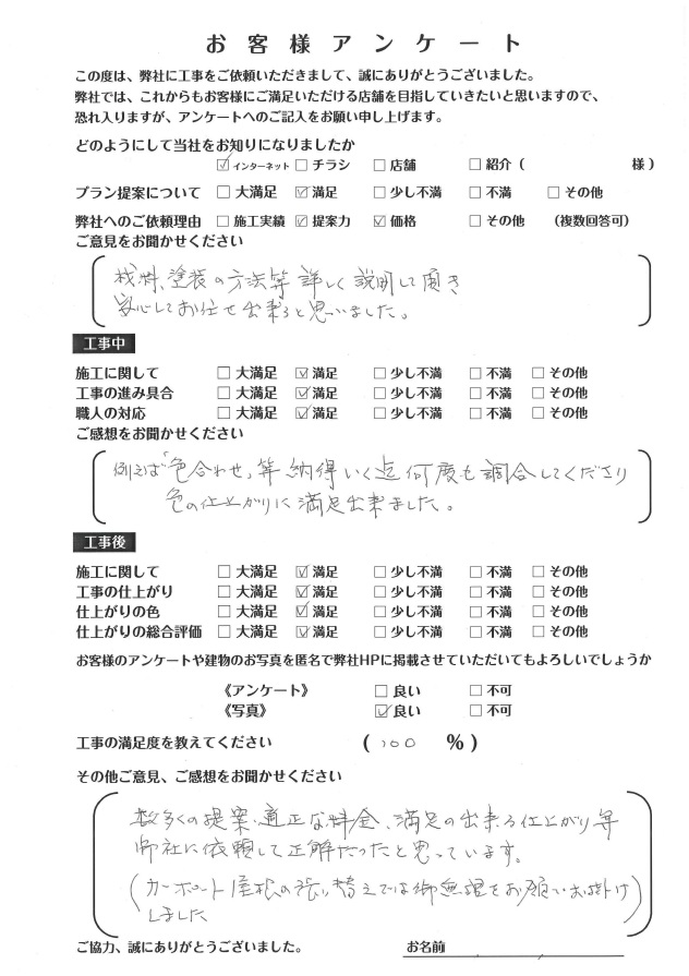 この度は、カルテットに工事のご依頼をいただきましてありがとうございます。お施主様のご期待とご要望にお応えできる高品質施工をお届けできたと思います。仕上げ色も、イメージ通りで満足度の高い評価で、施工スタッフに対しても高い評価を頂き、社員一同感謝の気持ちで一杯です。