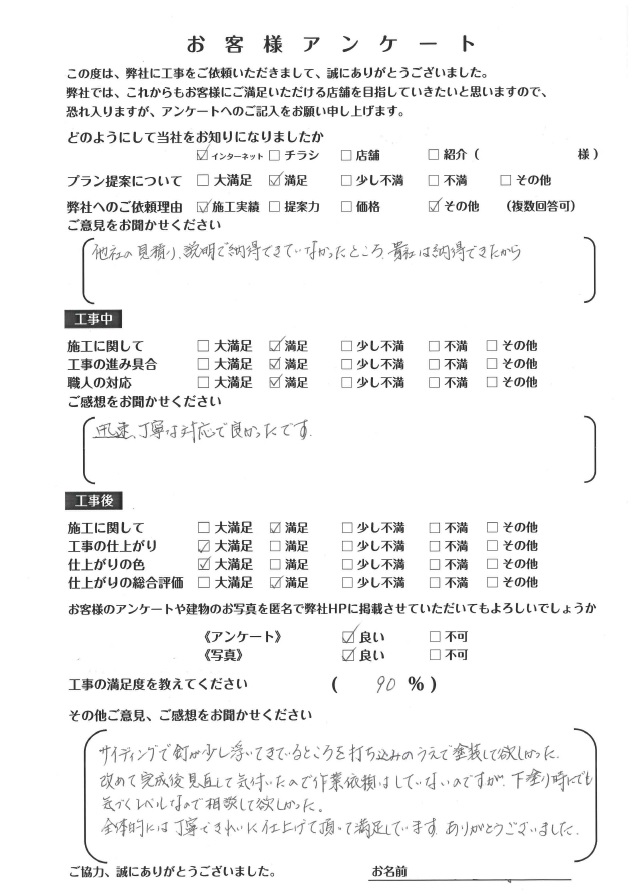 この度はカルテットに工事のご依頼いただきましてありがとうございました。工事期間中もお心遣いありがとうございました。社員一同感謝の気持ちで一杯です。工事の施工品質には、絶対の自信がありますのでご期待ください。仕上げ色もイメージ通りの外観でご満足いただき我々も嬉し限りです。工事完了後もしっかりとメンテナンスの対応をさせていただきますので、ご安心ください。